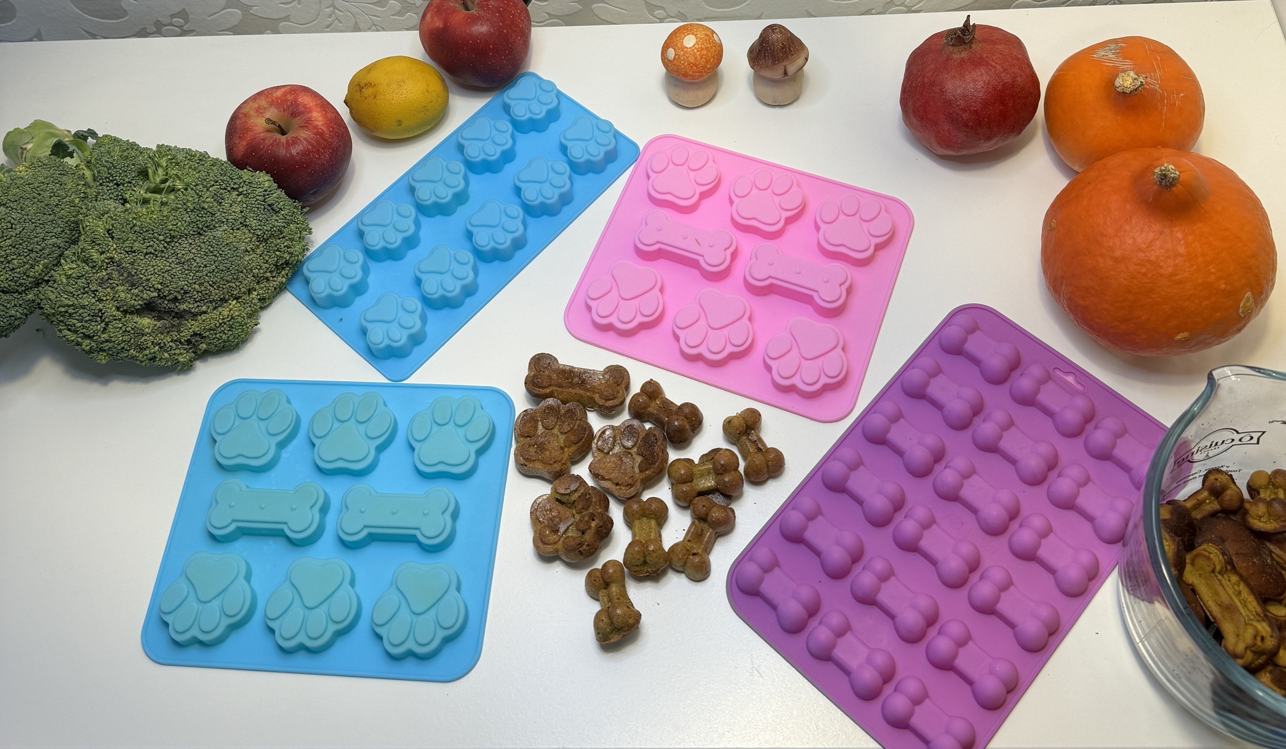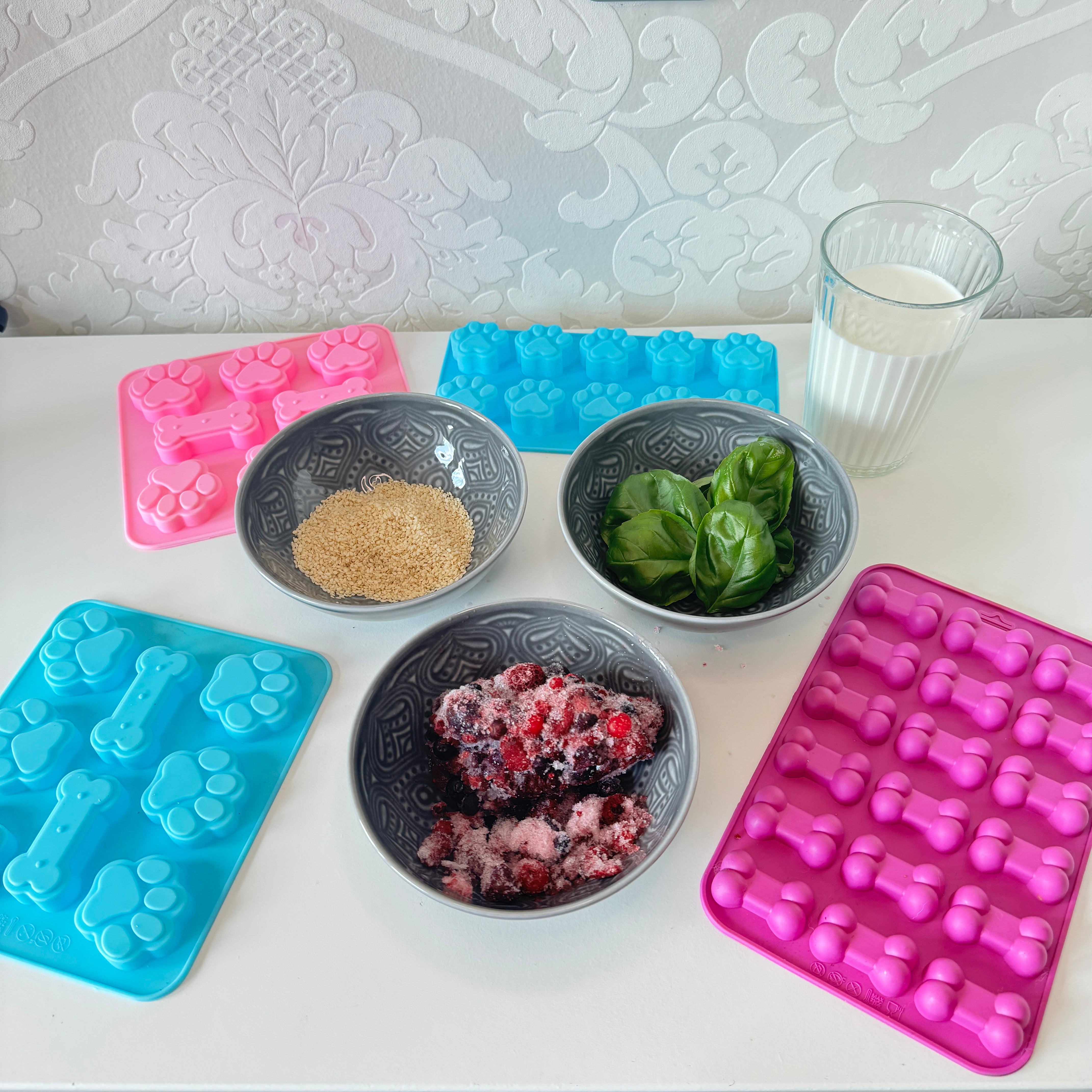 🦴Vier Silikonformen und drei Ausstecher: Geeignet sowohl für herzhaft-köstliches Backvergnügen als auch für frostig-spannenden Gefrierspaß.